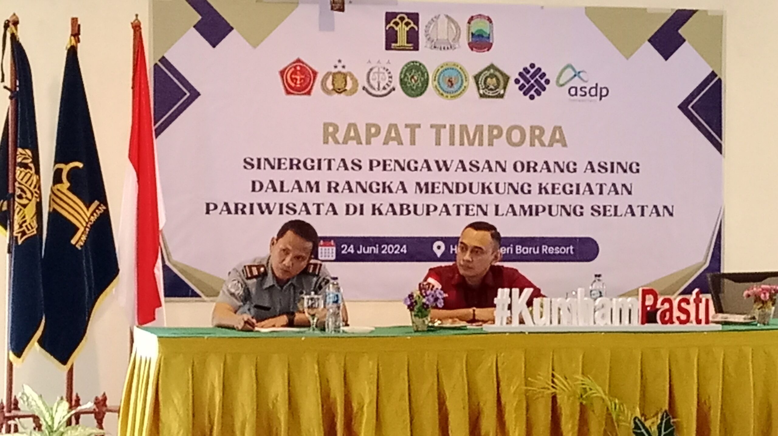 Beritapro.net, Kalianda,- Kantor Imigrasi kelas III Non TPI Kalianda mengadakan Rapat Tim Pengawasan Orang Asing (TIMPORA), di hadiri Forkopimda dan Stakeholder terkait, yang digelar di Aula Negri Baru Resot, Kecamatan Kalianda, Kabupaten Lampung Selatan, Senin (24/6/2024).